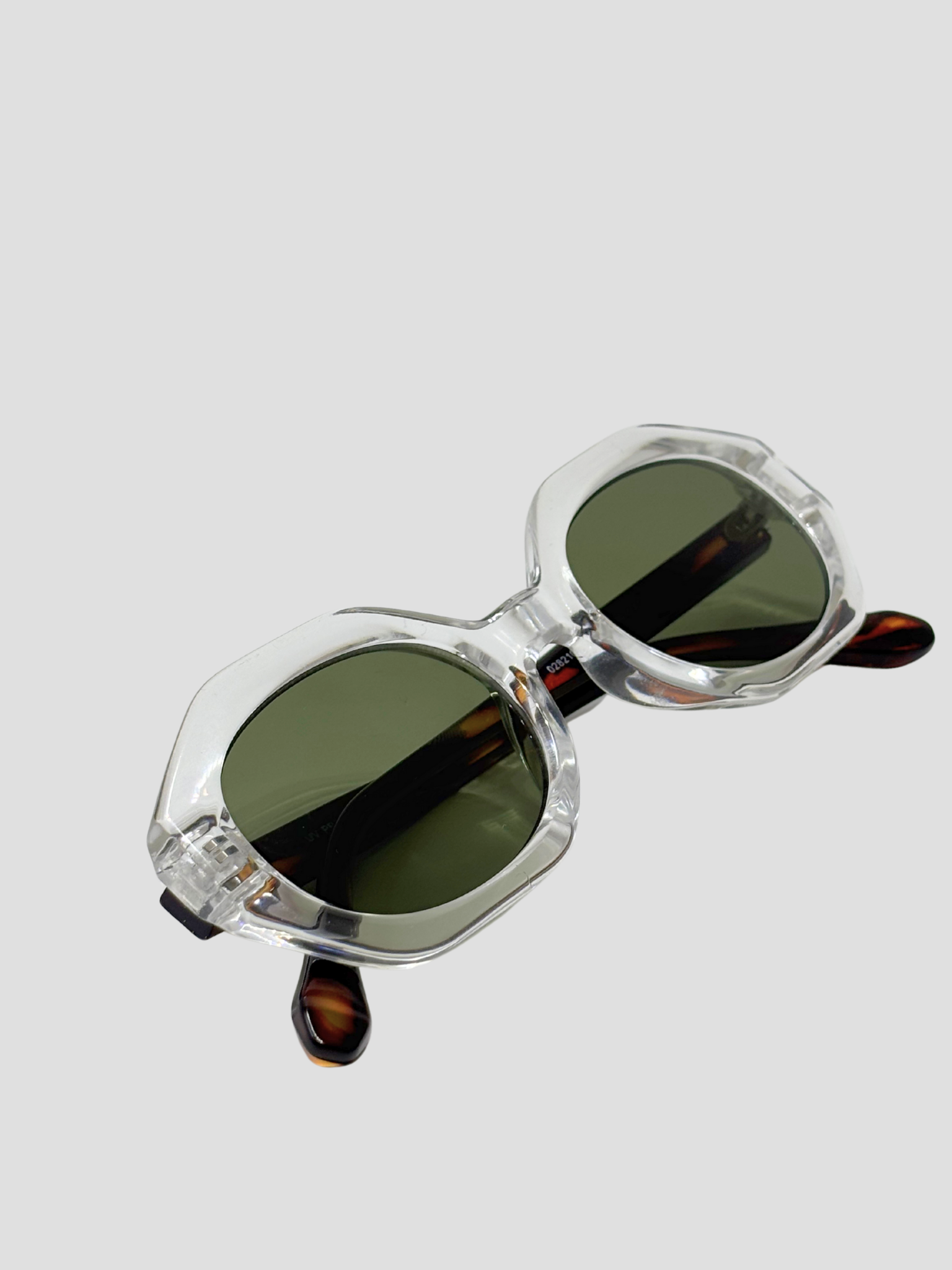 Diese auffällige Sonnenbrille mit transparentem Rahmen und grünen Gläsern kombiniert stilvolles Design mit hohem Tragekomfort. Gefertigt aus hochwertigem Acetat bietet sie optimalen UV-400 Schutz für sonnige Tage – leicht, stabil und ein Statement für Individualität.